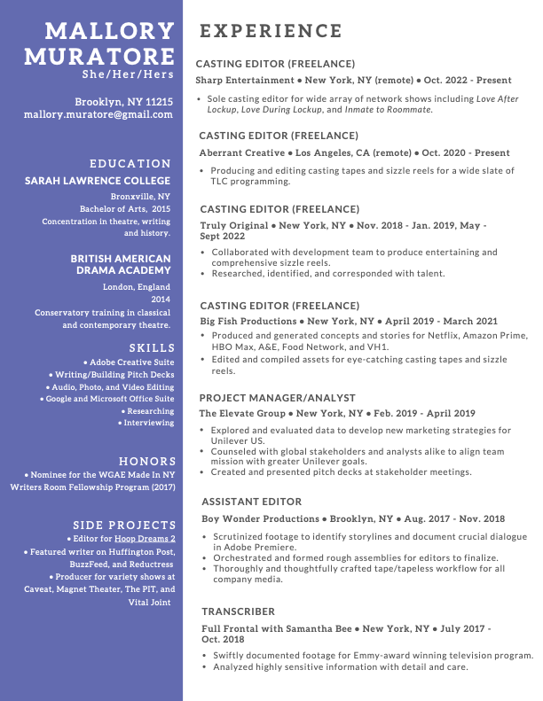 This hottie has edited and produced content for Amazon Prime, Netflix, HBO Max, A&E, VH1, TLC, Food Network, History, and HGTV. Her writing has been featured on Reductress, HuffPost, BuzzFeed, and Medium. She recently worked on Hoop Dreams 2 and is a WGAE Made In NY Writers Room Fellowship Program nominee.
